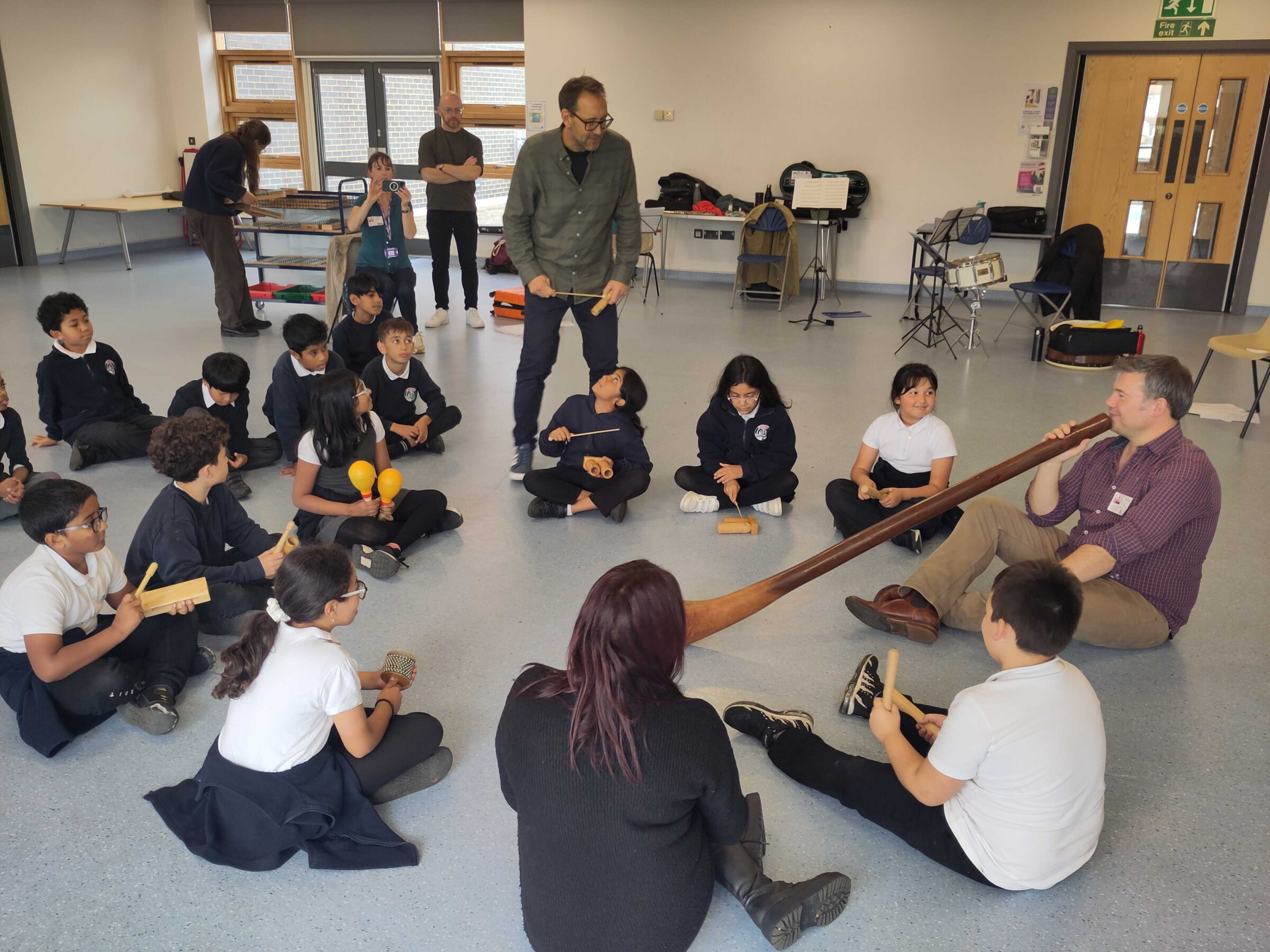 Over the three days, the students worked in small groups to develop their own soundscape compositions using a variety of percussion instruments. The workshop days culminated in a final performance for friends, family and fellow students where the Year 5 classes performed their compositions. Alongside this, they performed songs and dances they had learned during the workshops, accompanied by the OPO ensemble.